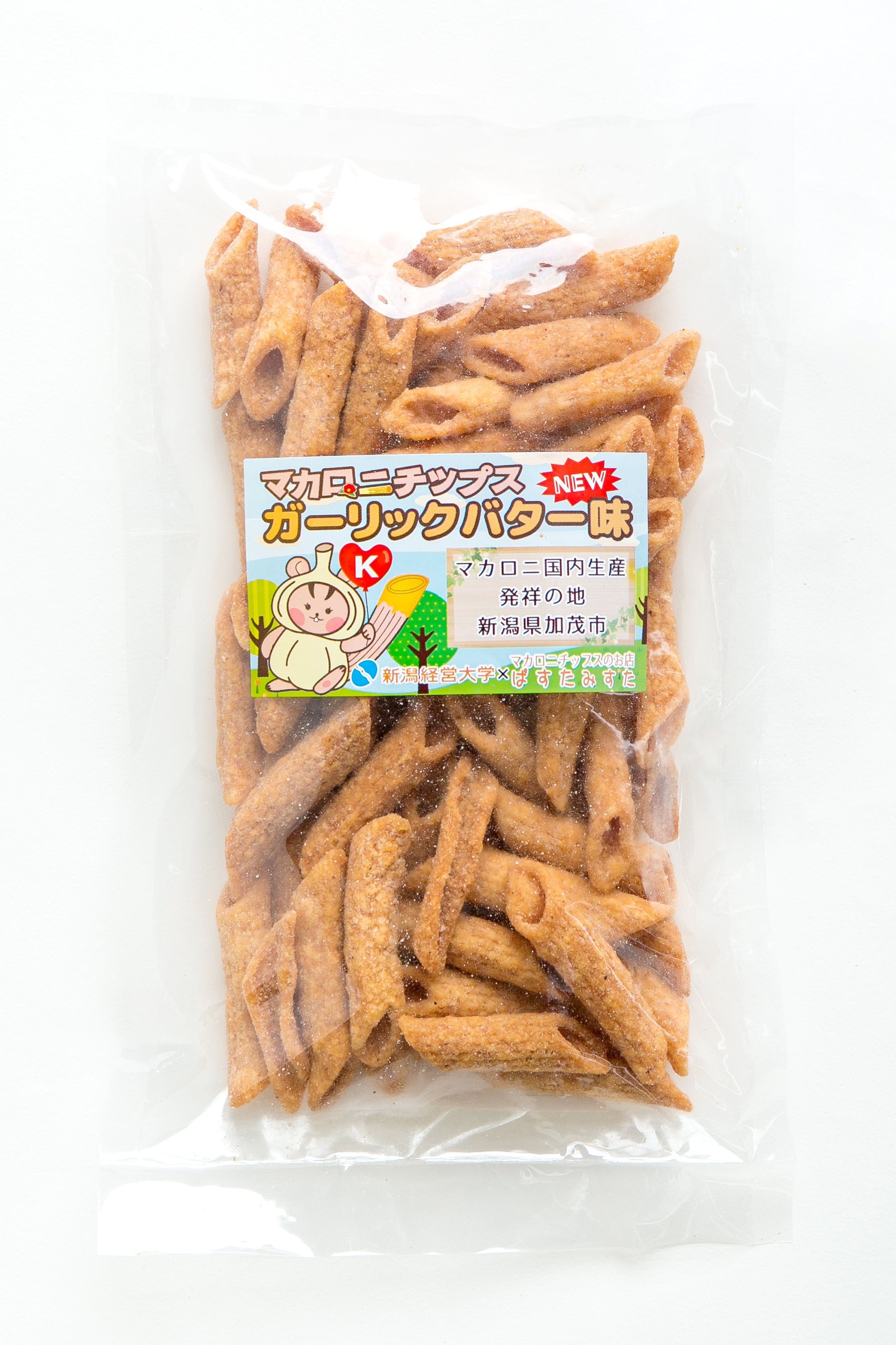 ぱすたみすたのマカロニチップスで地元新潟経営大学の学生さんとのコラボ商品のガーリックバター味です。
